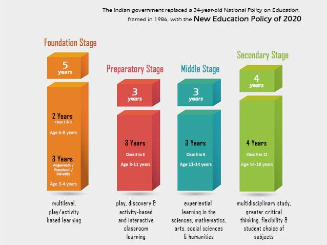 Foundational stage: This stage covers the ages of 3 to 8 and includes three years of pre-primary education (anganwadi or preschool) and two years of primary education (classes 1 and 2). The focus of this stage is on developing language skills, numeracy skills, and basic cognitive abilities through play-based and activity-based learning. The medium of instruction will be the mother tongue or the local language till at least grade 5.